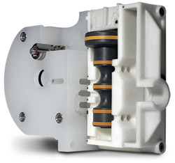 The Pro-Flo patented air distribution system incorporates three moving parts: The unbalanced air valve spool, the pilot spool, and the main shaft/diaphragm assembly. The air valve spool location directs pressurized air to one air chamber while exhausting the other. The pressurized air chamber causes the main shaft/diaphragm assembly to move outward discharging liquid on that side and pulling liquid in on the other side. When the shaft reaches the end of its stroke, the opposite inner piston actuates the pilot spool. The pilot spool location either pressurizes or exhausts the large end of the unbalanced air valve spool. When the large end is pressurized, the piston is forced up so that the air supply is routed through the air valve spool to the right side of the pump. When the large end is exhausted, the piston is forced down so that the air supply is routed through the air valve spool to the left side of the pump.